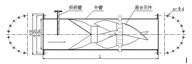 如圖所示,管式混合器由投藥管、混合元件和外管組成。投藥管置于混合器上游,原水加藥劑后,經過各混合元件時產生
